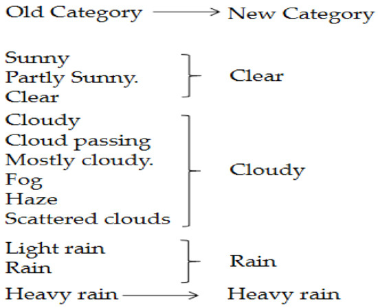 Besides the above external factors, weather conditions have a notable influence on taxi demands [2]. A weather dataset from 1 September 2013 to 30 November 2013 is also obtained by web data crawler tool from the timeanddate website [26]. For ease and simplification, weather categories are converted into categories defined as shown in Figure 3.