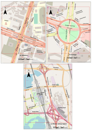 For the sake of more accurate results, the trips with a distance less than 200 m or trip period less than 3 min or number of GPS records less than five have been removed and are not considered in this study. Finally, the dataset considered 29,984,635 trips, and this number is sufficient for performing taxi demand prediction. Figure 5 shows three selected study areas in the city of Wuhan, (a) Jiedokou, (b) GuangGu area, and (c) Wuhan railway station area.