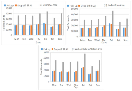 Figure 6 shows taxi demands distribution in Weekdays and Weekends of three study areas in the city of Wuhan.