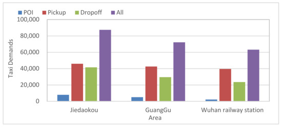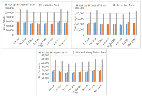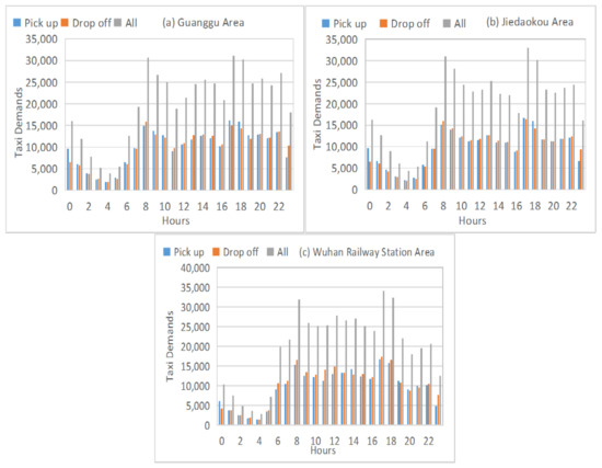 Figure 8 reports taxi demand distribution during a day (24 h) in the areas in Wuhan city.