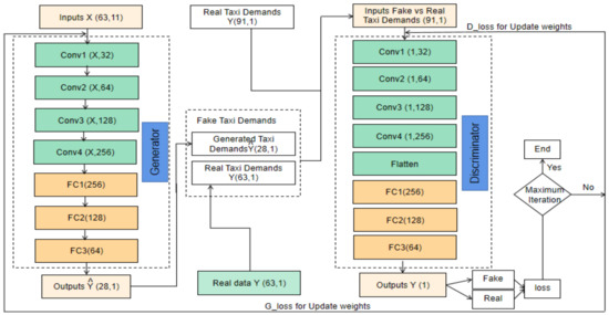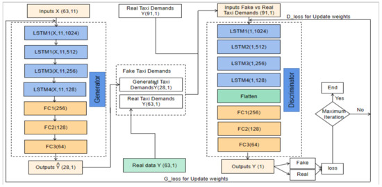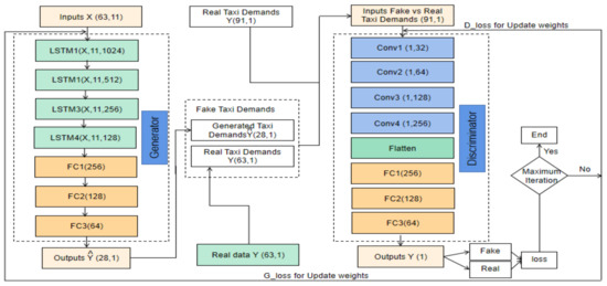 - The generative adversarial networks (GAN) model is adopted to perform taxi demand forecasting. In the GAN, the long short-term memory (LSTM) structure is selected in the generative network, whereas the Conventional network is used in the discriminator network to enable the GAN model to deal with fundamental factors and related patterns naturally.
