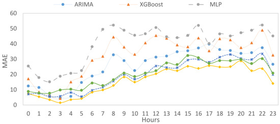 Figure 18 plots the mean absolute error (MAE), which describes the prediction accuracy. There is a dramatic decrease at the early hours of a day until it reaches 1.4 (the lowest point) in the GAN_LSTM_CNN model at 3 am, following with a gradual increase until 22, and then a further sharp fell is found.