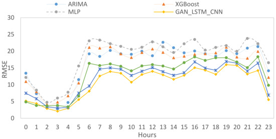 RMSE Comparison Results with hours ranged from 0–23 with increasing values from 6:00 to 22:00 and all deep learning methods achieved better results.
