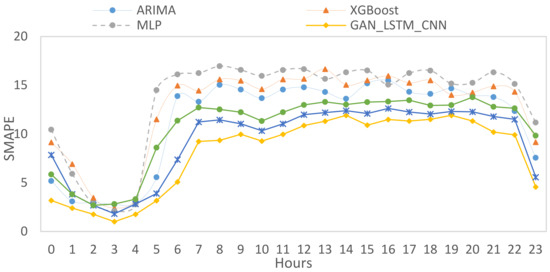 As shown in Figure 19 and Figure 20, sMAPE presents the mean absolute error, whereas RMSE shows the root mean squared error between the predicted demands and the real demands. The values dropped from 3 am until 10 am, in which the value becomes lower again, then a noticeable increase has emerged again. GAN_LSTM_CNN model also provides the minimum MAPEs and RSMEs, which shows the highest accuracy between the predicted models adopted in this paper.