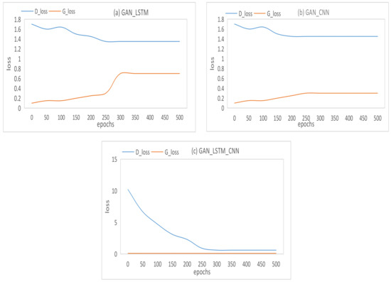 Figure 21a,b showed the loss of the GAN_LSTM and GAN_CNN. The blue line represents the loss path of the discriminator, and the orange line is the generator’s loss path. From the beginning, the loss of discriminator is higher than the loss of generator, and through the training process, both loss paths become flat.