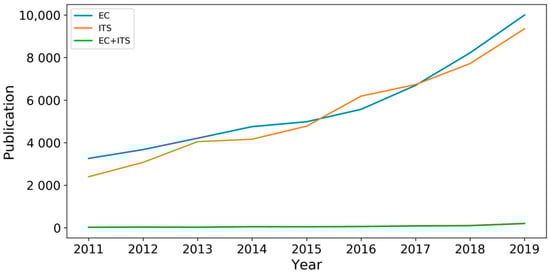 From the numbers themselves, we might conclude that EC and ITS are two unrelated research fields. Nevertheless, with careful investigation, this is not the case at all. In several of the most highly cited survey papers on edge computing [1,2,3], the summarized key applications of edge computing included smart transportation, connected vehicle, wireless sensing, smart city, traffic video analytics, and so on. These are core research topics in ITS. They envisioned that, with the wide spread of mobile phones, sensors, network cameras, connected cars, etc., cloud computing would no longer be suitable for many city-wide applications. Edge computing would be able to leverage the large amount of data produced by them. On the other hand, we observed more and more studies and articles on applying edge computing to ITS (e.g., [4,5,6,7,8,9]). Though still in a relatively small number, these studies are innovative and show great potential to branch out into new ideas and solutions.