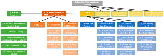 Therefore, the statistics in Figure 1 actually unveil a big gap and high demand in future research on the combination of EC and ITS. In this paper, we conduct a survey on recent advances in ITS, especially ITS sensing technologies; we then propose the challenges in ITS sensing and how EC may help address them, as well as future research opportunities in applying EC to the area of ITS sensing. Note that EC could benefit not only ITS sensing but also other components of ITS, such as data pre-processing, traffic pattern analysis, and control strategies; however, in this paper, we mainly focus on EC’s application in ITS sensing and present a detailed survey. The structure of the content in this paper is displayed in Figure 2.