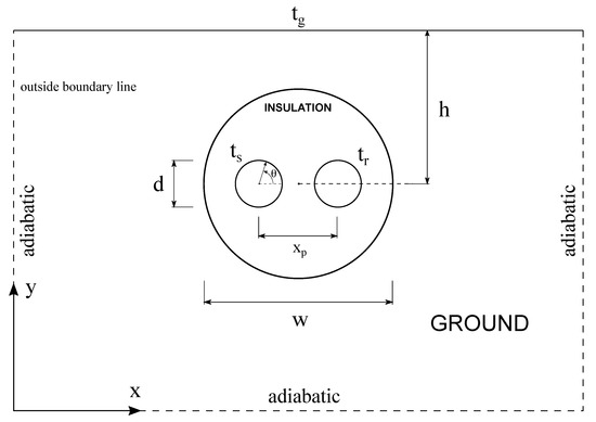 The related boundary conditions are: (a) and at the outer surface of the supply pipe and at the ground surface, respectively, (b) at the outer surface of the return pipe, (c) at the bottom horizontal pseudo-boundary line and (d) at both of the vertical pseudo-boundary lines, where X and Y are the dimensionless horizontal and vertical Cartesian coordinates normalized by the tube diameter d, respectively. Additionally, the heat flux and temperature continuity at the interface between the insulation and the surrounding ground are also imposed, which means and where n denotes the normal to the interface, while the subscripts “i” and “g” denote the insulation and the ground, respectively.