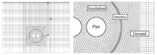 The governing equation, in conjunction with the boundary conditions stated earlier, is solved by means of a control-volume formulation of the finite-difference method using the open-source framework OpenFOAM [19]. A new solver, derived from the combination of the basic solvers named scalarTransportFoam and chtMultiRegionFoam, has been developed with the purpose to compute the heat transfer across adjacent solid regions with different thermophysical properties. According to the geometry of the system, fine cylindrical polar grids are used in close proximity of both the outer surface of each tube and the inner and outer surface of the insulation, whereas the remainder of the interior of the insulation and the surrounding ground at a short distance are filled with linear triangular elements. Conversely, a Cartesian grid is used to discretize the integration domain at a larger distance from the pipeline, as depicted in Figure 2.