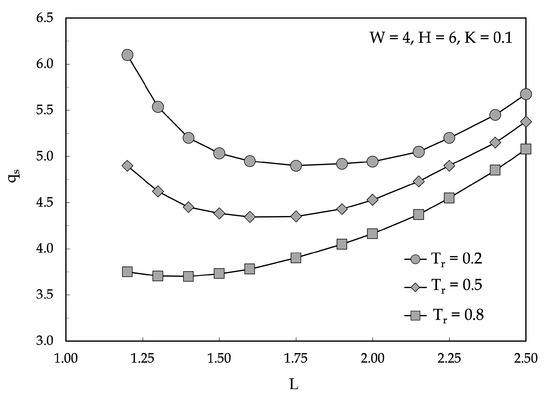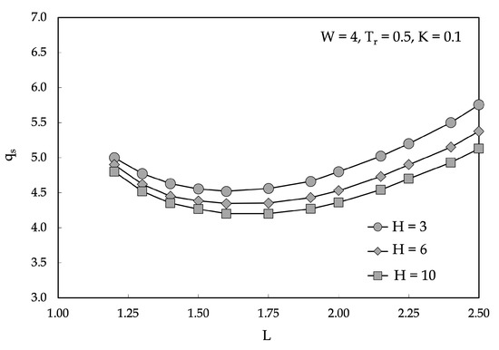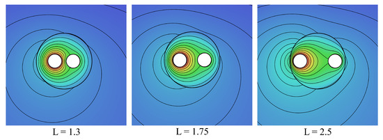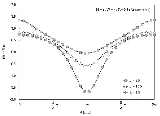 The selected local results are displayed in Figure 3 and Figure 4, in which equispaced isotherm contours are plotted for , and and . As expected, the temperature field in the ground is featured by an eccentric distribution with a higher isotherm concentration in the region between the ground surface and the pre-insulated double pipe. On the other hand, the highest temperature gradients are localized within the insulation, in which the distance between the pipes plays the most important role in determining the heat transfer rate from the supply pipe to the return pipe, and from each pipe to the ground surface. In fact, for small center-to-center spacings, most of the heat loss from the supply pipe is “gained” by the return pipe; conversely, when the pipe spacing is large enough, the higher insulation thickness between the pipes results in a growth of the amount of heat transferred to the ground surface. Therefore, the thermal resistance existing between each pipe and the ground surface is affected by the heat transfer rate occurring from the supply pipe to the return pipe, which means that increases as L is decreased. This is clearly illustrated in Figure 5 and Figure 6, in which the heat flux at the supply and return pipe surfaces are plotted for and . Additionally, is expected to increase as the burial depth H is increased, as reported in Figure 7. In parallel, the thermal resistance existing between the supply and return pipes increases as L is increased and H is decreased, as displayed in Figure 8. Hence, an optimal dimensionless pipe spacing of for the minimum heat loss from the supply pipe for a prescribed temperature imbalance assigned between the pipes has to be expected, as displayed in Figure 9, where a number of distributions of the dimensionless heat transfer rate from the supply pipe are plotted versus L for different values of , showing that the optimal pipe spacing decreases as the temperature of the return pipe increases.