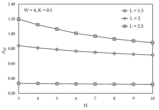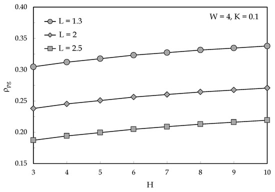 Distributions of the dimensionless thermal resistance versus H using L as parameter.