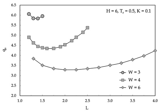 The effects of W, H and K on the heat loss from the supply pipe are then pointed out in Figure 10, Figure 11 and Figure 12 in which, for any independent variable, a number of distributions of are plotted versus L using the variable itself as a parameter. It is apparent that the minimum heat loss increases as the insulation diameter decreases, whereas all of the other controlling parameters have more limited effects, at least within their investigated ranges of variability. Furthermore, it can be noticed that the optimal pipe spacing increases as the insulation diameter and the burial depth are increased.