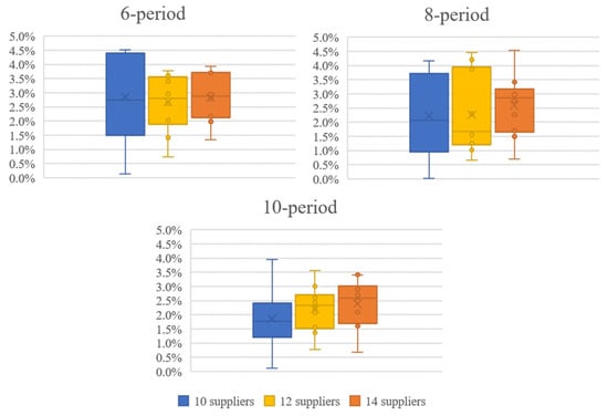 Results of the test are given in Table 1, Table 2 and Table 3, which show solution values of the heuristic and CPLEX, CPU times, and percentage errors of the heuristic solutions from the solutions (or lower bounds) obtained by CPLEX. As can be seen from Table 1, for only 4 instances (with ten suppliers) out of 30 instances, the percentage errors were larger than 4%. Table 2 and Table 3 show similar results for larger instances. These results demonstrate the performance of the suggested heuristic algorithm that can give reasonably good solutions regardless of the length of the planning horizon. Additionally, the heuristic shows almost the same performance regardless of the number of the suppliers. The overall average percentage error (PE, %) of the 90 instances was 2.43%. Figure 1 shows the summary of the results of percentage errors according to different number of periods and suppliers. As shown in the figure, we could not find significant correlation between problem size and the percentage error.