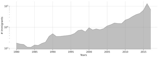 In the Latin American context, Chile presented the greatest increase in the weight of the immigrant population between the last two censuses [64]. Although immigration is not a new phenomenon in Chile, it has increased dramatically in recent years and has become a relevant issue in the national debate (see Figure 1). The immigrant population grew from 1.27% of the total population in 2002 to 4.35% according to the 2017 Census, with a more diverse origin for all immigrants than in previous years. As of 2017, 66.7% of all resident immigrants arrived in Chile from 2010, and 61% arrived in 2015–2017 (considering up to 19 April 2017, the date of application of the census).