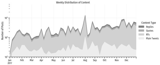 To crawl tweets that discuss immigration in Chile, we connected to the Twitter Streaming API using a system designed to crawl Chilean tweets [68]. The query parameters were keywords related to immigration, e.g., “inmigración” (immigration), “inmigrante” (immigrant), “fronteras” (borders), “racismo” (racism), etc.; and origin countries with their respective denomyms. Thus, the dataset after data cleaning is composed by 160,775 tweets (54,252 are plain tweets and 106,532 are retweets—RTs–. In addition, 20,248 tweets are quotes and 19,265 are replies) that are on topic during 2017, written by 36,698 users (see Figure 2 for the temporal distribution of content).