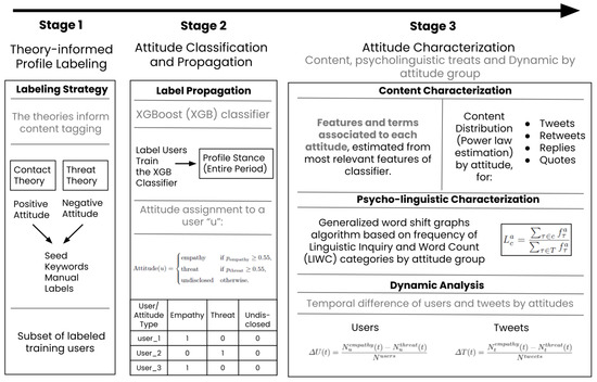 In this section, we describe how to classify, quantify and characterise the attitudes toward immigration. The methodology is composed of the following steps: theory-informed profile tagging, which enables to pinpoint some users with an attitude; propagation of user attitudes to the rest of the dataset, after training a classifier with the tagged users; and then perform a characterisation of attitudes from the lens of users, content, psycholinguistics, and dynamics. A schematic diagram of the methodology is shown in Figure 3.