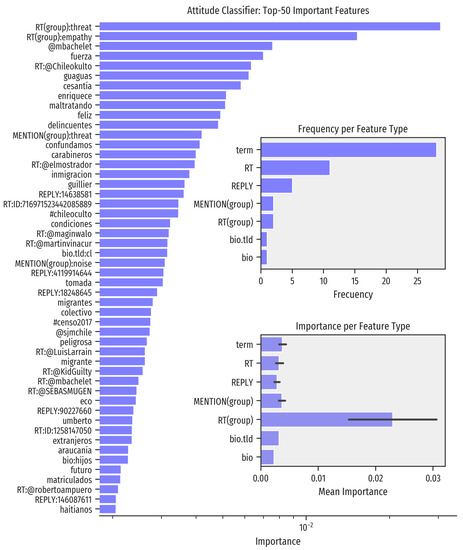 Figure 4 presents the top-50 features according to their importance in classification. These features include: retweets to accounts that were be automatically tagged with each attitude, mentions to then-president Michelle Bachelet (@mbachelet), attitude-relevant terms such as cesantía (unemployment), delincuentes (criminals), inmigración (immigration), migrantes (migrants), and haitianos (Haitians); and mentions to migrant-support institutions as @sjmchile (Jesuit Center for Migration). The remaining features in the top-50 include interactions with authors of viral tweets, and terms relating to specific content, such as a quote by Umberto Eco.