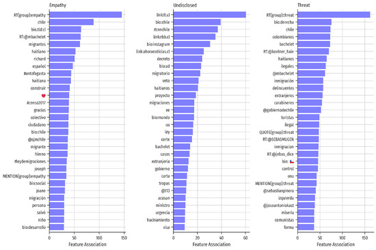 To better understand the discussion driving the expression of positive and negative attitudes towards immigration and answer our question RQ2, we performed content analysis producing a characterisation of the most frequently used terms associated with each user stance profile. We weighted each term using log-odds ratios with an Uninformative Dirichlet Prior [73]. Figure 5 displays the top-30 attributes per attitude, revealing that own-attitude retweeting behaviour is the most prominent feature for empathy and threat. This is arguably expected due to homophilic interactions [72], a phenomenon that has been observed in political discussion in Chile [78]. However, care must be taken when interpreting the result, as this reflects interactions with accounts that were pre-labelled only. A plausible explanation is that highly popular accounts that can be labelled through methods tend to make their positions explicit.