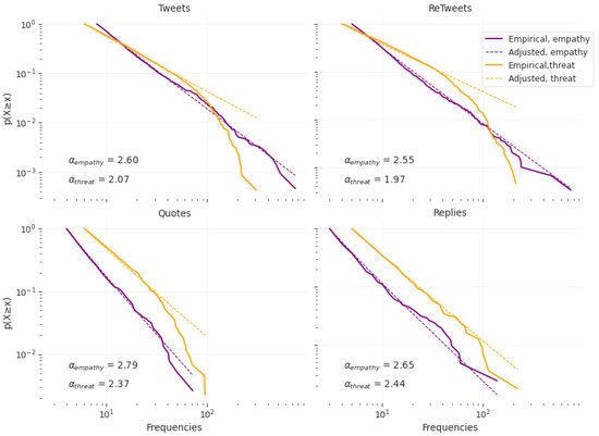 To identify and quantify differences in the diffusion of content generation, by both groups of attitudes, we analysed the respective distributions of the number of tweets, retweets, quotes and replies. Because other studies suggest that these measures of content generation follow a powerlaw distribution [75,79], we fit powerlaw regressions on the distributions of the aforementioned measures. Figure 6 reports the results. Theoretically, a symmetrically diagonal line would indicate perfectly equal spread generation of content. A perfectly horizontal line would indicate high concentration of the content generation by a single user. Figure 6 reveals a relatively symmetrical distribution in the generation of content for empathetic users across tweets, retweets, quotes and replies. This contrasts with the distributions associated with the threat group that displays higher concentration of content generation in a small number of users, with consistently lower powerlaw exponents to empathetic users. This is particularly prominent for retweets suggesting a high degree of interaction within the social network of threat users. These findings confirm our previous interpretations that while our dataset includes a small number of threat users, they are more vocal and a minority of these users tend to generate a comparatively larger amount of content than empathy users.