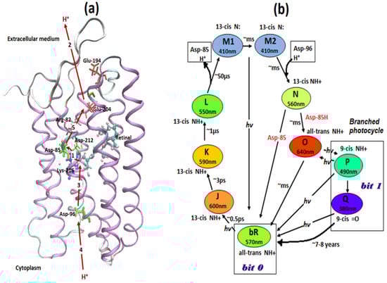 Bacteriorhodopsin (bR) is a widely explored photoactive protein for a variety of biomolecular electronics applications, including optical memory storage [1,2]. bR is a membrane protein found in the salt marsh archaeon, Halobacterium salinarum, and comprises a photoactive moiety called retinal chromophore (C20H28O) in the middle of a channel formed by seven transmembrane alpha helices (A–G) [3]. It has a primary role of facilitating proton transportation and, therefore, generating a proton gradient across the cell membrane through a photochemical cycle [3]. This photocycle is a series of conformational changes caused by photoexcitation and de-excitation of covalently linked retinal chromophore atoms with the amino acid Lys216 via a protonated Schiff base linkage [1]. When bR is exposed to yellow light (~570 nm), it undergoes photoisomerization from an all-trans to 13-cis isomer and deprotonates by donating its extra hydrogen to the proton accepter Asp85 amino acid [4,5]. This protonation causes a proton release to the extracellular surface from the Asp212, Arg82, Glu204 or Glu194 amino acids [4,6,7,8,9,10,11,12], after which a re-protonation occurs by the proton donor Asp96 amino acid [4,13]. This cyclic reaction leads to the formation of different conformational and photochemical intermediate states (photostates J, K, L, M, N and O) before returning to the ground state (bR) in around 4–5 ms. This results in a net translocation of one proton across the membrane (Figure 1a) [1,14].