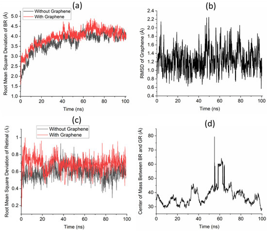 Stability analysis of bR and graphene during the 100 ns simulations: (a) Root Mean Square Deviation of bR with and without graphene; (b) Root Mean Square Deviation of graphene. (c) Root Mean Square Deviation of Retinal in the presence and absence of graphene; (d) Distance between the center of masses of bR and graphene.