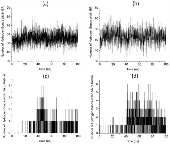 Role of hydrogen bonds in bR–graphene interactions: (a) Hydrogen bonds within bR in the absence of graphene; (b) Hydrogen bonds within bR in the presence of graphene; (c) Hydrogen bonds within 5 Å of the retinal in the absence of graphene; (d) Hydrogen bonds within 5 Å of the retinal in the presence of graphene.