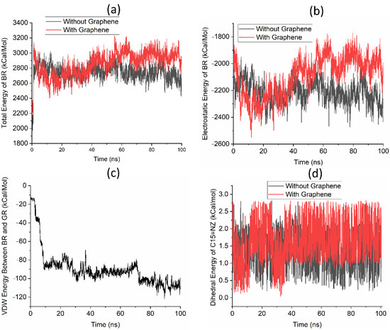The total energy measured in the analysis comprises the non-bonding interaction energies (van der Waals and electrostatics) between graphene and the bR protein. The total energy value of bR protein in the presence of graphene decreases initially but then increases up to ~3150 kcal/mol at ~60 ns. After that, it remains stable around an average value of 2900 kcal/mol (Figure 4a). On the other hand, for bacteriorhodopsin without graphene, the total energy decreases gradually to 2600 kcal/mol. Comparing the two cases, the increase of ~500 kcal/mol in the presence of graphene is a clear indication of the adsorption of bR onto the surface of graphene. In regards to electrostatic energy, for bR–graphene it was ~400 kcal/mol lower than for the control, indicating that the adsorption of bR onto graphene is largely due to the VDW interactions (Figure 4b). In the case of VDW energy, there are two adsorption events that are observed at ~10 ns and ~70 ns, where the VDW energies are found to be ~90 kcal/mol and ~110 kcal/mol (Figure 4c). These energies together indicate changes in the conformational arrangements that are occurring in the bR protein. Such behavior in energy is also apparent in the key dihedral C14-C15 = NZ-CE, which is a double bond between the carbon C15 of retinal and the nitrogen NZ of the amine group of the LYS216 residue of bR (Figure 4d). In Figure 4d, the increased dihedral energy of bR–graphene suggests that it undergoes structural change due to the adsorption of bacteriorhodopsin onto graphene. Details of these dihedral analyses are given in the following Section 3.6.