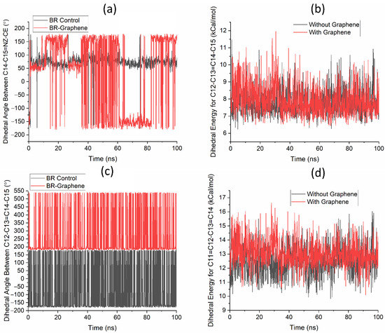 The trends in dihedral energy values were analyzed and it was evident that for the dihedral C12-C13 = C14-C15 (Figure 5b), there were greater energy values in the presence of graphene. This is most clearly visible in the case of C11 = C12-C13 = C14 dihedral (Figure 5d) and C14-C15 = NZ-CE dihedral (Figure 4d) introduced in Section 3.5. In the bacteriorhodopsin Three State Model, the protein reaches an energy barrier during photoexcitation to achieve a 90° twist around the C13 = C14 double bond and advance from ground state (S0) to S1 [32,33]. It is envisaged that with increasing rest state energies, observed in the bR–graphene dihedrals, it is easier to overcome this barrier as well as reach energy values that are required to undergo sufficient twisting for a complete photocycle.
