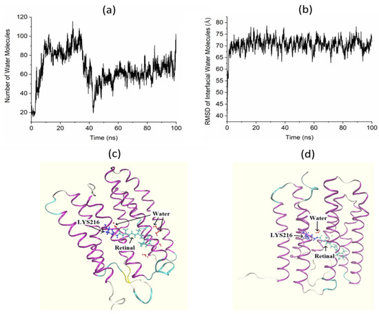 For the first ~30 ns of the bR–graphene simulation, there were ~90 interfacial water molecules between bacteriorhodopsin and graphene. The number of water molecules then began to decrease at around 40 ns when bR was close to the graphene surface and ultimately stabilized at around 60 molecules once bR and graphene were at an optimal distance from one another (Figure 6a). The RMSD of the interfacial water molecules, however, was practically stable throughout the simulation (Figure 6b), which is a sign of stable adsorption of bR on the graphene surface and indicates that the interfacial water molecules were also crucial in regulating the interface. Comparing the presence and absence of graphene, there were more water molecules at the active site in the presence of graphene (Figure 6c) compared to the control (Figure 6d). From Figure 3d (Section 3.2), the number of hydrogen bonds around the active site also increased at ~40 ns in the presence of graphene, which can also be attributed to the favorable interactions between bR and graphene. Furthermore, it is understood that water molecules play a key role in the transportation of protons from one amino acid site to another during the photocycle. This is largely due to the hydrogen bonding of water molecules to the proton donor and acceptor groups [36]. As a result, more H bonds and increased water molecules around the active site means a greater probability that the photocycle is achieved.
