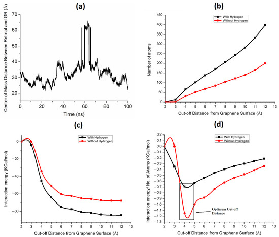 The distance between graphene and the retinal changes with time and reduces to ~22 Å from the initial distance of ~34 Å at 0 ns (a 12 Å approach due to the adsorption of bR on graphene surface) (Figure 7a). The conformational rearrangement of the retinal is the direct result of the adsorption of bR onto graphene. Moreover, an average number of bR atoms including hydrogen atoms (~11 atoms) are present at a 3 Å distance from the graphene surface. This number of atoms constantly increases as the cut-off distance increases up to 12 Å (Figure 7b). The attractive energy between these atoms and the surface of graphene also continuously increases with the distance ranging from 2 Å to 6 Å and becomes stable after 10 Å (Figure 7c). A comparison was done with and without hydrogen atoms to understand the interactions between heavy atoms (oxygen, carbon and nitrogen) as the heavy atoms are more stable. Figure 7d shows the optimal distance between the bR and graphene, where a minimum number of atoms interact with maximum energy and, hence, play a crucial role in stabilizing the interface. It was found that this optimal cut-off distance is ~4.2 Å.