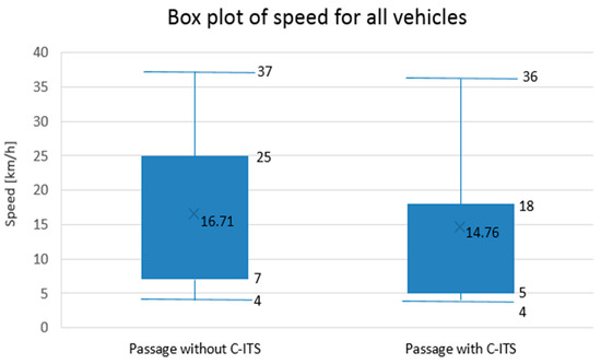 The average driver′s speed is shown in the box plot in Figure 8. This examines how the actual speed changed with the C-ITS warning about the approaching public transport vehicle. Comparing the two passages, we can state a speed reduction (approx. 4 km/h) during the passage with the C-ITS unit.
