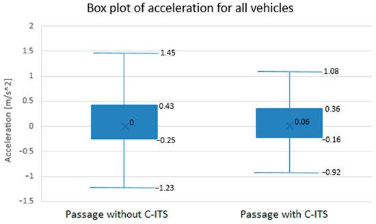 The second KPI selected for comparison was driver acceleration which is shown in Figure 9 and Table 4. Acceleration comparison does not show large differences with the use of a C-ITS unit. In both cases, the acceleration is centered around zero acceleration. The maximum and minimum acceleration values do not indicate significant braking or acceleration. When using a C-ITS unit, greater uniformity of driver acceleration can be seen on the range (1.35 m/s2 smaller with C-ITS) and standard deviation (0.17 m/s2 smaller with C-ITS), as well as lower average braking before without a C-ITS device. The sharp braking, which is taken when the deceleration of 5 m/s2 is exceeded during the evaluation rides, was not exceeded in either of the two passes.