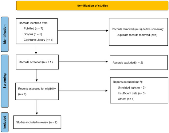 We also searched PubMed, Embase, and the Cochrane Library for studies published in English up to May 19, 2021, with the terms “endoscopy” and “bedside” and “COVID,” in accordance with the Preferred Reporting Items for Systematic Reviews and Meta-Analyses (PRISMA) statements [8]. Our inclusion criteria were the English language, full-text paper, and including the text recommendations regarding endoscopic management of SARS-CoV-2 positive patients in endoscopy. The papers that did not fulfill these criteria were excluded. At the end of our research, 11 papers were eligible, but only 2 fulfilled our inclusion criteria (Figure 1) [9,10]. The few findings from this systematic review suggested that endoscopy at bedside did not reduce endoscopy-related mortality but seemed to be related to overall mortality in severe COVID-19 patients. However, these studies had substantial shortcomings, such as heterogeneous patient populations, mainly single-center experience, lack of well-defined protocols, and use of various endpoint definitions.