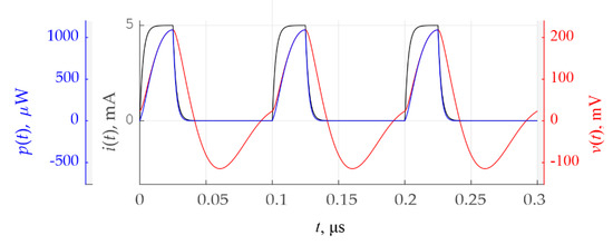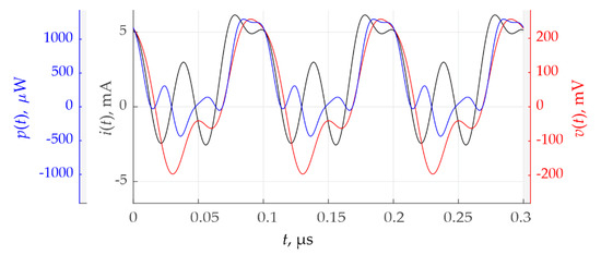 The following quantitative power characteristics were calculated: the average power (33) Pav = 297.1 μW, apparent power (39) Papp = 537.2 μVA, power factor (43) PF = 0.55.