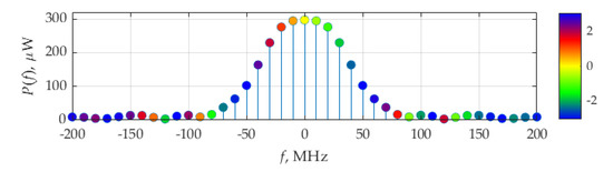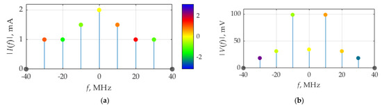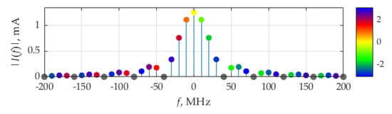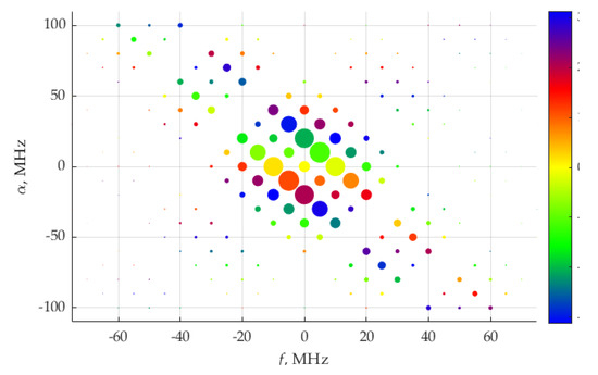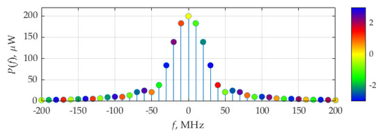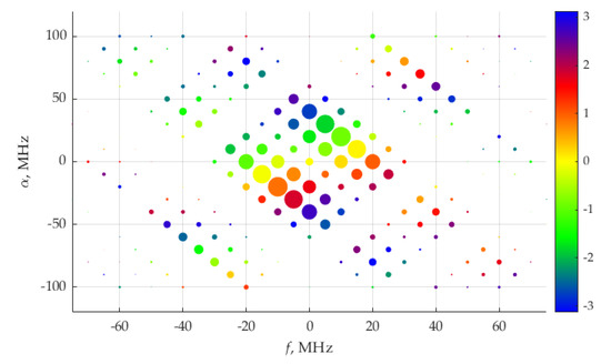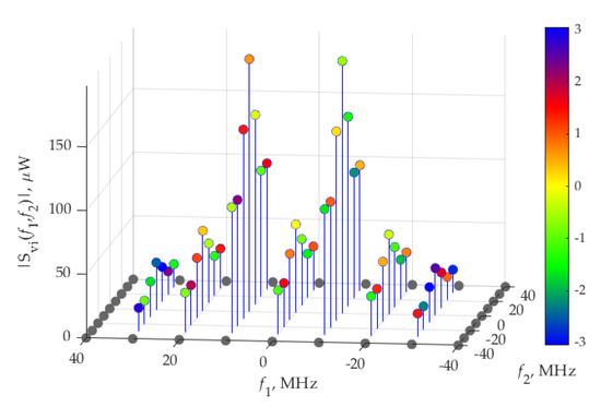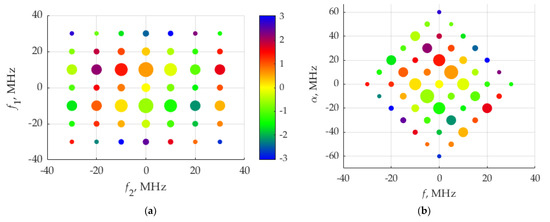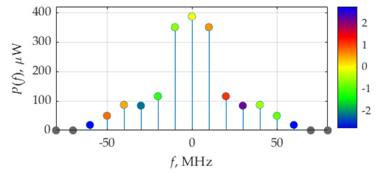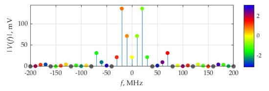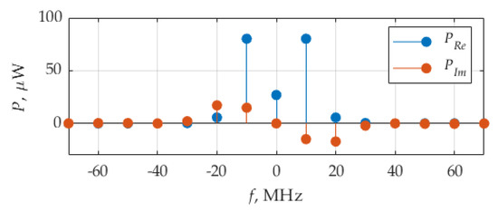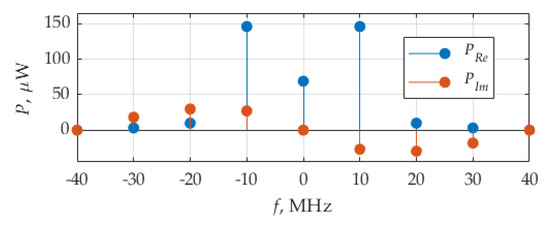 Figure 18 shows the distribution of the real and imaginary parts of average power. The weights of the delta function of the real part are maximum at frequencies ±10 MHz, which correspond to fundamental frequency, F, of the considered signals. The imaginary part of delta function weights is maximum by its absolute value at frequencies ±30 MHz.