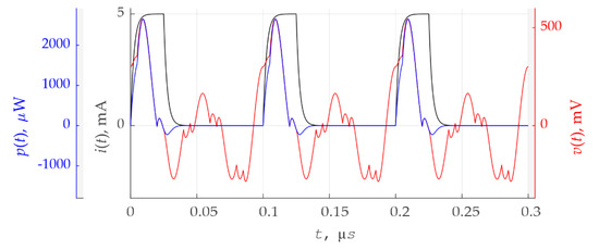 Figure 19 shows the spectrum of p(t). The delta functions forming the spectrum of instantaneous power p(t) are at the same frequencies as the delta functions forming the spectrum of instantaneous current i(t) and voltage v(t). The first five spectral components are higher with respect to the dc component than took place in the case of the resonant circuit without transmission line (Figure 13).