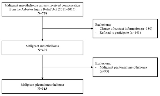 - Ahn, Y.-S.; Kang, S.-K. Asbestos-related Occupational Cancers Compensated under the Industrial Accident Compensation Insurance in Korea. Ind. Health 2009, 47, 113–122. [Google Scholar] [CrossRef] [PubMed]