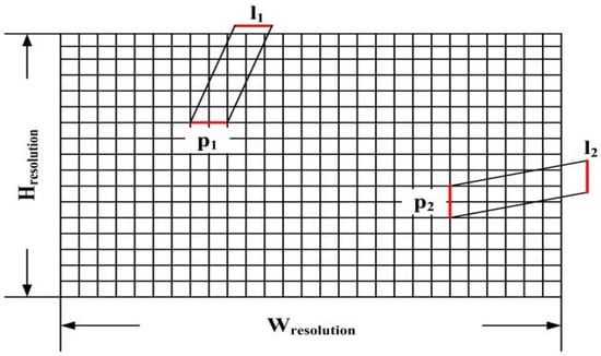 where W and H are the horizontal and vertical resolution values (pixels) of the sensor and w and h are the horizontal and vertical dimensions (mm) of the sensor. If Equation (3) is substituted into Equation (2), vertical or horizontal length is defined as Equation (4) below.