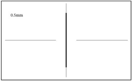 Cracks occur in structures over time due to various external forces and structural and environmental factors, and vary widely in width, length, and shape. In order to properly measure a crack, the pixel value of the video image must correspond to the value of the actual crack width. Therefore, in this experiment, linear virtual images were produced to substitute for the sizes of microcracks. As can be seen in Figure 3, the images were produced to improve the contrast between the lines and the background, and the lines were produced in 0.1, 0.3, and 0.5 mm widths. As experimental measurement variables, the pixel values and widths of each virtual image were measured according to the differences in the resolution of the imaging equipment at the same focal length and changes in the focal length at the same resolution of the imaging equipment, as shown in Table 1.