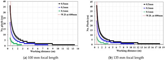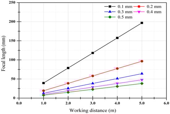 The lens collects light and sends it to the image sensor, and the working distance is secured according to the specifications of the lens. The types of lenses can be divided into wide-angle, telephoto, standard, and prime. Wide-angle lenses enable shooting wider background ranges compared to standard lenses and shooting large pictures of subjects that cannot be approached from distant locations. Prime lenses are only suitable for either long distances or short distances, thereby minimizing the problems above. The focal length of the lens necessary to satisfy accuracy in the determined working distance range can be obtained by using Equation (5). Figure 4 below shows the focal lengths according to the working distances necessary to acquire the size of the subject clearly and accurately. In this study, lenses that can optimize the performance of digital high-definition cameras were selected. The applied lenses consisted of 50, 100, and 135 mm single-vision lenses selected according to manufacturer, and the specifications of the lenses are shown in Table 2. As for the range of the final working distances, the distances to the points where the values of the size of one pixel corresponding to individual line widths become the same were set as the measurement limit distances.