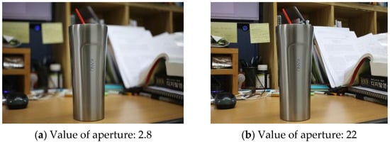 There were five image shooting methods: fully automatic shooting, shutter priority, aperture priority, program auto, and manual exposure modes. In the case of the fully automatic shooting mode, everything in the camera is set to automatic, and as for shutter and aperture priority-based modes, the shutter and aperture are adjusted to obtain an exposure value that corresponds to the brightness of the subject. In general, whereas the shutter speed is adjusted when shooting dynamic images, an aperture priority-based shooting method is used when shooting static images. In this experiment, an aperture priority-based shooting method was used to obtain clear video images. As can be seen in Figure 5, when the aperture value is low, the foreground part in focus is clear, but the background is blurred, and when the aperture value is high, the overall video image is clear.