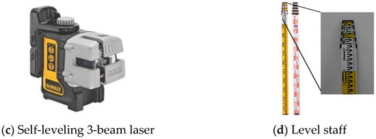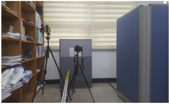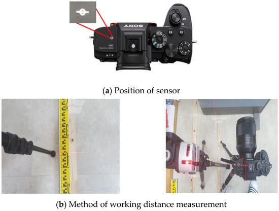 The working distance was measured by measuring the distance from the virtual image plane to the position of the camera sensor using an aluminum staff used for level measuring. As can be seen in Figure 6a, the position of the camera sensor is indicated by the focal plane mark, a Saturn-shaped symbol on the top of the camera. Since it was difficult to measure the sensor position, a three-axis self-leveling laser was used to match the position of the sensor with the position of the staff scale, and the distance between the virtual image plane and the sensor plane was measured as shown in Figure 6b. The equipment and working distance measuring method used in the experiment are shown in Figure 6c,d. Feng et al. (2015) conducted numerical studies to quantify the error resulting from camera non-perpendicularity. The range of the optical axis tilt angle was from 0° to 30°, and they determined that the error increases as the tilt angle increases. However, they discovered that a measurement error of less than 1% was determined at a 30 degree optical axis tilt angle, and this measurement error is acceptable [29]. Therefore, the orthogonality between the image plane and object surface was not considered in this study. Figure 7 shows an overall view of the indoor measurement experiment, and image shooting was carried out until the final working distance of each linear virtual image was reached, while changing the working distance in units of 10 mm to acquire the images.