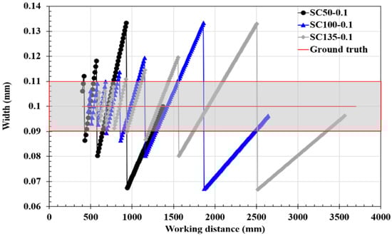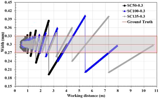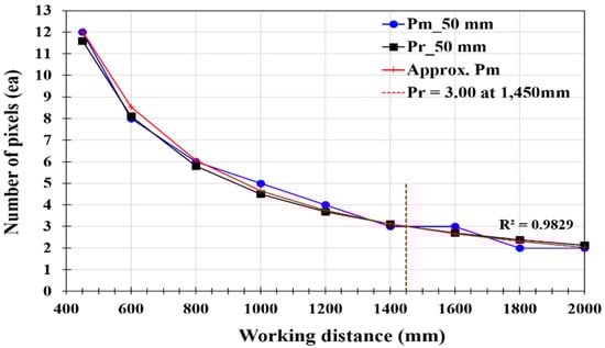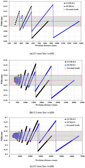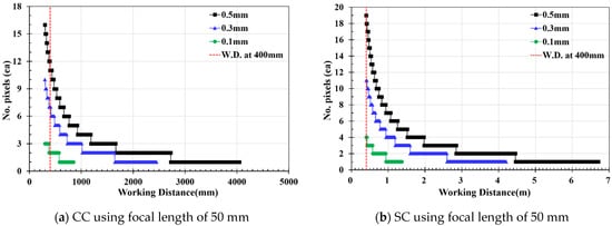 The pixel values measured using CC50 and SC50 at a working distance of 400 mm are shown in Table 3 and Figure 8. The pixel values measured while the width value increased by five times from 0.1 mm to 0.5 mm show a resulting increase by 5.5 times from 2 to 11 in the case of CC, and by 4.75 times from 4 to 19 in the case of SC, at a working distance of 400 mm. When the width value was 0.1 mm, the relevant working distance was 850 mm in the case of CC and 1370 mm in the case of SC, with an increase of 1.61 times, and when the width value was 0.3 mm, the relevant working distance increased by 1.63 times from 2450 to 4010 mm, and when the width value was 0.5 mm, the relevant working distance increased by 1.64 times from 4050 to 6650 mm. Therefore, it was confirmed that the number of pixels measured and the limitation of working distance increased dependence on the resolution of the image sensor and the size of the object. Regardless of the proportional relationship for all the variables, it was found that the number of pixels acquired exponentially decreases as the working distance increases. Additionally, the number of pixels at the minimum working distance does not proportionally increase as the physical dimensions of an object increase.