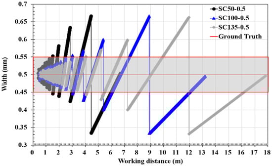 Given the basic image processing theory, the smallest unit of digital images is expressed as integers in pixel units [31]. However, in order to accurately measure crack widths, the measured pixel values should be in decimal units, but this is not the case in practice. To help understanding, the measured pixel counts and width values of SC100-0.5 and SC50-0.5 within the same shooting section range among the resulting values derived using SC equipment are shown in Figure 15, where Pm is a pixel value measured through image processing and Pr is a value obtained by dividing the ground truth value by the GSD value according to the working distance applied to each focal length, which can be calculated using Equation (6).