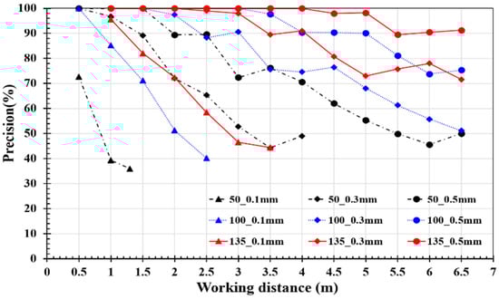 In the results of measurement of a 0.5 mm wide virtual image, in the case of SC100-0.5, 663 out of 1274 working positions within the measurement limit distance of 13,300 mm had values within PWL-10, representing a ratio of 52.41%, as seen in Figure 13. When checked by the shooting section, it was found that measurement precision was secured over the entire section, from the minimum working distance to 3 m. As for SC135-0.5, all working positions within 4 m had values within PWL-10, and the precision decreased afterward so that 98.20% of all working positions within 5 m had values within PWL-10. The resulting value was 89.49% in the shooting section within 5.5 m, but the precision increased slightly after that so that 91.26% of all working positions in the shooting section within 6.5 m had values within PWL-10. The reason for the slight increase after decreasing is that the number of working positions that had values within PWL-10 remained the same, while the working distance continued to increase. In the shooting section within 7 m, the value was 86.66%, and as the working distance increased, 900 out of 1727 sections within the measurement limit distance of 17,960 mm had values within PWL-10, representing a ratio of 52.70%. The overall precision seems to have increased slightly compared to SC100-0.5, and the reason is judged to be the fact that not only the maximum shooting section but also the number of working positions that had values within PWL-10 increased.