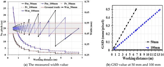 (a) The actual number of pixels of a 0.5 mm wide virtual image and the measured width value based on the measured pixel value; (b) GSD value at 50 mm and 100 mm focal lengths according to working distance.