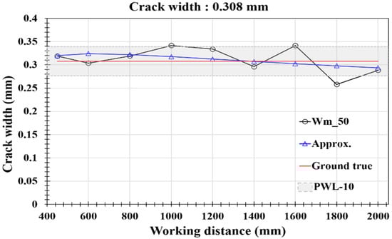 Table 9, and Figure 18 and Figure 19 indicate the number of pixels (Pm), measured crack value (Wm), and errors (Em) according to the width value of the target crack through image processing. In addition, the estimated pixels in Table 9 were derived using the approximation curve in Figure 18 and crack measurement using the estimated pixels illustrated in Figure 19. Regression analysis using the power law was carried out, and the coefficient of determination was 0.9829. The approximated pixels (Pa), crack width (Wa), and error (Ea) were the calculated crack width and errors according to the working distance, respectively. Here, Pa showed a similar tendency to the pixel Pr corresponding to the actual crack. Moreover, the Wa calculated by the estimated pixel indicated an error of up to 5% and a great agreement with the ground truth. However, the biggest Em was 19.32% at the working distance of 1800 mm, while the rest of them were less than 10%. As the working distance increased, the Wm did not show a clear trend in error change and repeated the absolute increase or decrease, because the Pm was measured somewhat higher or lower than the value of Pa or Pr. As mentioned in Section 4.3, in order to accurately measure crack width, the Pm must be in decimal units. However, the Pm was computed as an integer, and it was found that the difference between Pm and Pr led to an error in the crack measurement. In addition, it can be seen that Pr becomes 3 at the position of 1450 mm where the Pm, Pr, and Pa intersect in Figure 18. Moreover, it can be seen that the measurement error at the same working distance represents positive or negative values, as shown in Table 9. As shown in Table 9 and Figure 18, it was indicated that the error increased as the distance increased, moving away from the reference position. In summary, it was judged that the pixel measured as an integer and the same pixel within a specific working distance range was the cause of the error in the crack measurement. From this evaluation, it was confirmed that the number of pixels corresponding to the working distance had a great influence on the measurement accuracy of crack width when using image processing. Once the working distance is accurately defined, it is judged that the number of pixels measured at each shooting location can be identified through the approximation method.