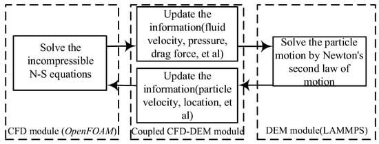 The analysis involves a coupled CFD-DEM solver known as SediFoam (the source code is available at https://github.com/xiaoh/sediFoam access date: 5 June 2017), which consists of three modules, i.e., the CFD module, the DEM module, and the coupled CFD-DEM module. As shown in Figure 1, motions of the fluid and the particle are processed, respectively, in the CFD module and the DEM module. Their interactions are realized through the coupling module.