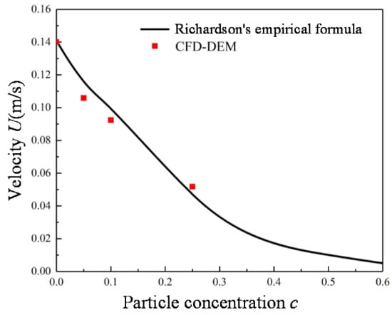 Figure 3 illustrates that the velocity of uniformly sized spherical particles varies the particle concentration during the settlement process. The simulated values agree well with the predictions of the empirical formula, which verifies the correctness of the CFD-DEM solver Sedifoam.