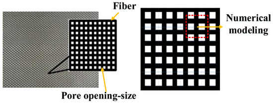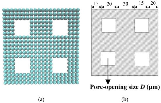 According to the manufacturing process [], the PVD membrane can presently be divided into the non-woven fabric and woven fabric. The former is obtained by the fusion of fiber molecules in random directions; while, the latter turns the fiber into yarn and interweaves in the orthogonal direction. In order to alleviate the complexity of modeling, only the woven fabric structure was taken into account, as shown in Figure 4. The PVD membrane was established numerically by rectangular arrangements of spherical particles that were uniform in size, as shown in Figure 5. There were 336 spherical particles of diameter 5 μm being used in establishing the membrane model, of which the dimensions were 100 μm (length) × 100 μm (width) × 5 μm (thickness). The particle packs represent the membrane fibers that were evenly spaced along both directions of the membrane plane. As compared in Figure 4, the present numerical model of membrane properly represents the actual fabric structure of the woven PVD membrane. The resulting openings bounded by the fibers were of a rectangular size, of which the equivalent diameter D was set to O95 of the PVD membrane prototype, i.e., D = O95 = 20 μm. Thus, the pore-opening size of the membrane model satisfies the corresponding industrial requirement in Table 3, i.e., O95 = 20 μm < 75 μm. It is noteworthy that this structure not only controls the equivalent pore-opening size, but also contributes to the permeability coefficient of the membrane. Moreover, the permeability coefficient, calculated by the coupled CFD-DEM solver, is k = 4.35 × 10−4 m/s, which meets the industrial manufacturing requirements of PVD membrane in Table 3, i.e., k ≥ 5 × 10−5 m/s.